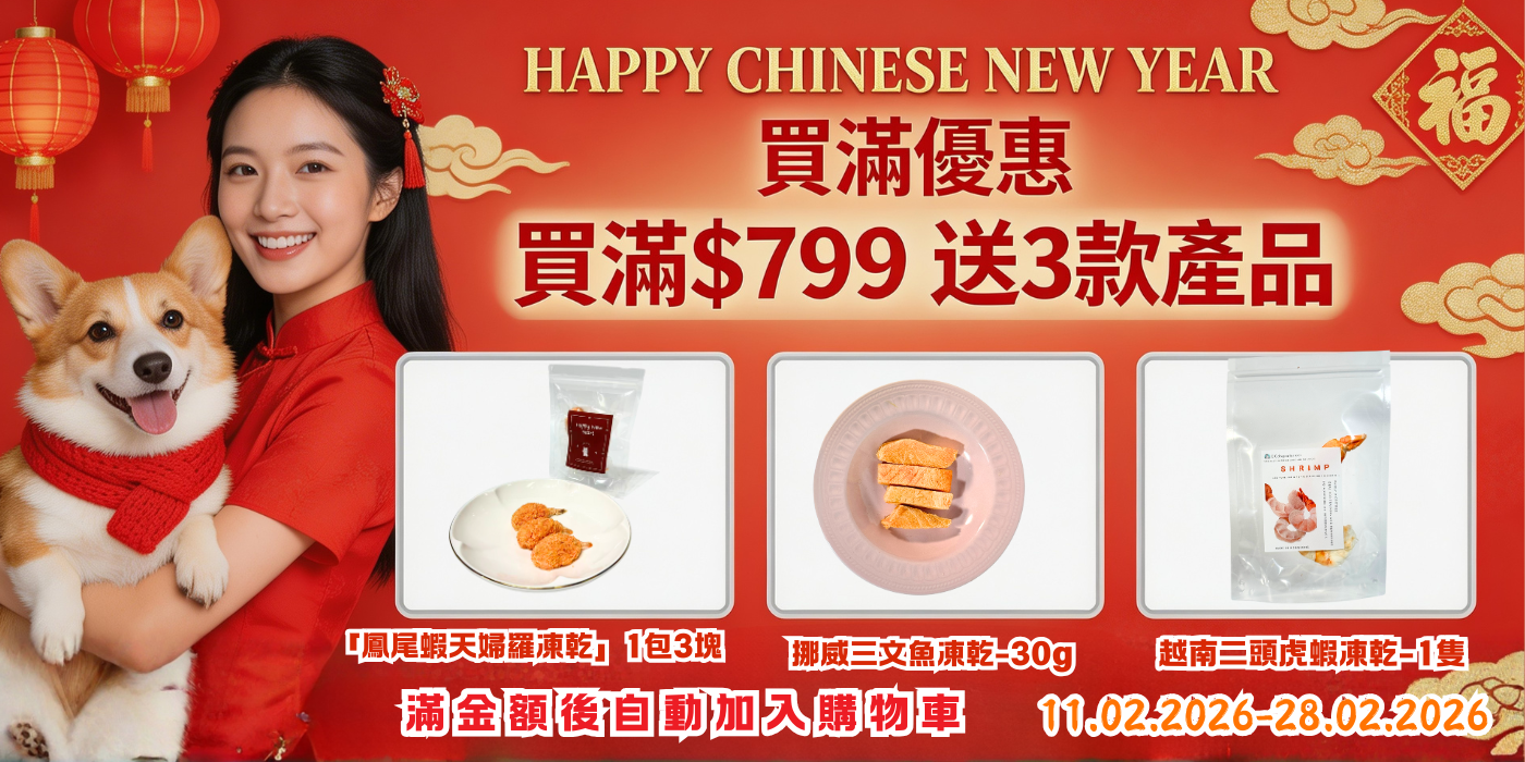 買滿$799 贈送 3款凍乾零食 (越南2頭虎蝦凍乾+無激素鴨肉塊凍乾+「日式天婦羅」凍乾)