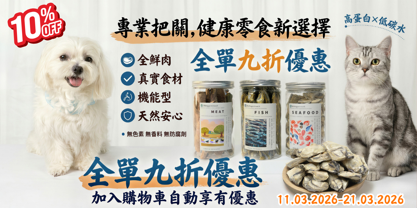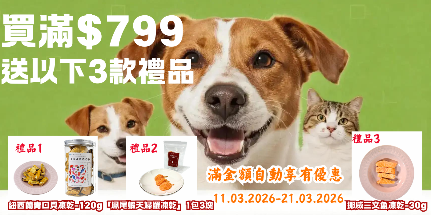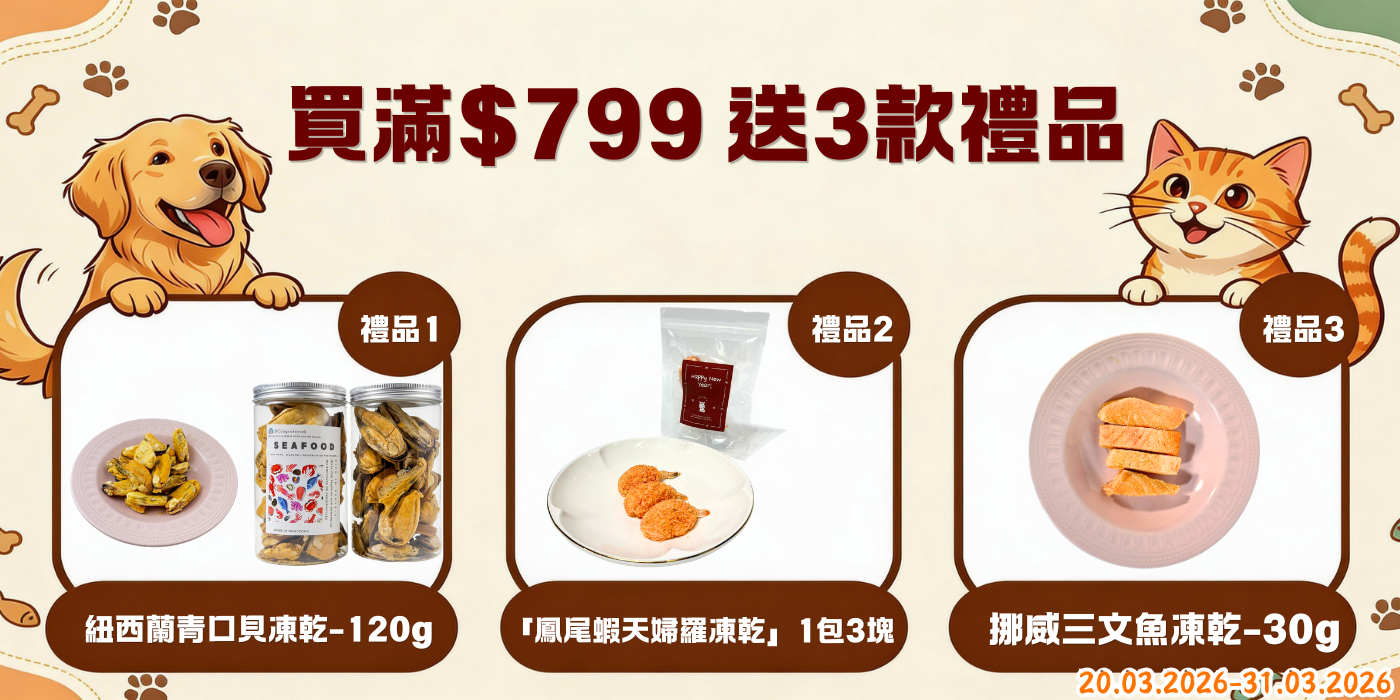 買滿$799 贈送 3款凍乾零食 (紐西蘭青口貝凍乾+挪威三文魚凍乾+「日式天婦羅」凍乾)